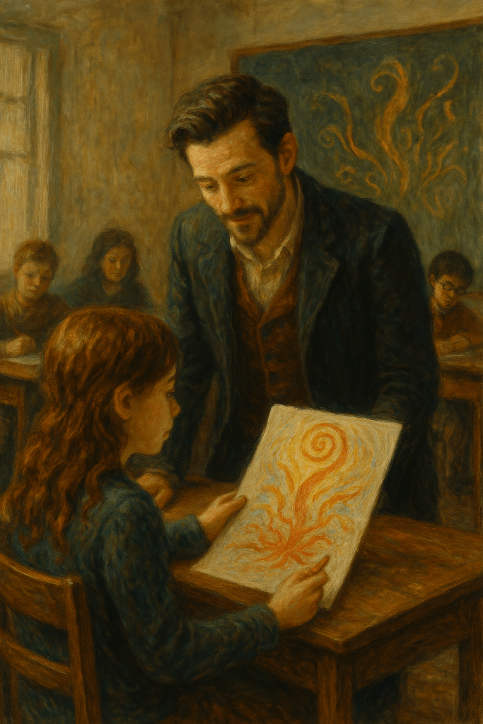 A student, silent as snowfall. She sat in the back of the room, her fingers always moving — sketching symbols, lines, shapes. Her eyes darted like birds, never resting. Others had called her distracted, difficult, perhaps even unreachable.