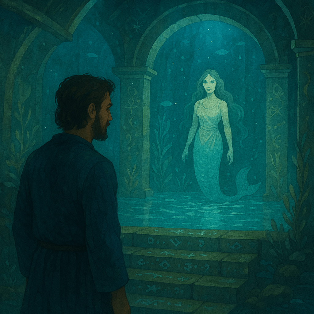 A silver staircase led down into still water. Beneath it: a submerged temple lit not by flame, but by bioluminescent truths — glowing runes, star-fish symbols, jellyfish-slow thoughts. This was the House of Depth, the 4th realm. And it was kept by two celestial beings: