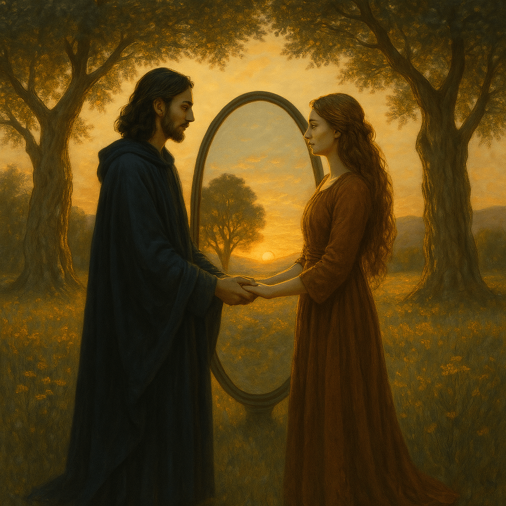 Alcarion wandered into a valley washed in golden dusk. The air was thick with silence, not of emptiness — but of presence. In the center of the field stood a mirror made of obsidian and moonstone, held between two ancient olive trees. This was the Gate of the 7th.