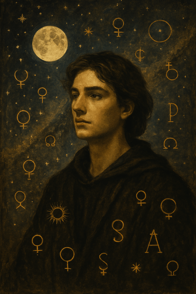 Inside his chart, tucked away in the secretive 12th House, gathered a constellation of minds and muses: Sun, Mercury, Psyche, Sisyphus, Spica, and Apollon, all in Libra. His light was inward, like a candle burning behind stained glass. Mercury gave him poetic thoughts, Psyche a sensitivity to soul-language, Spica the grace of rare intelligence. Sisyphus brought relentless effort, and Apollon wrapped it all in the gold of artistic vision and divine storytelling.